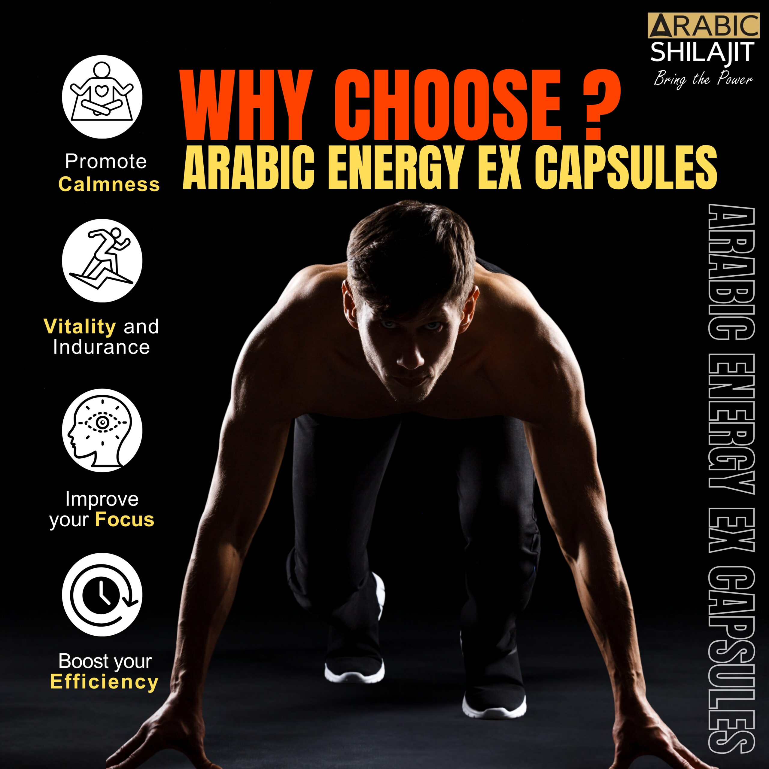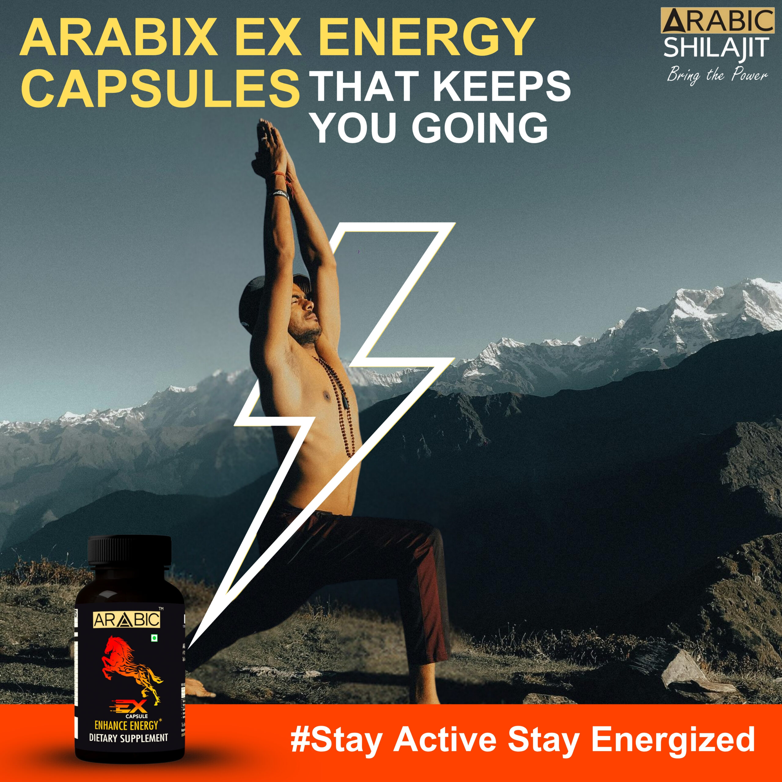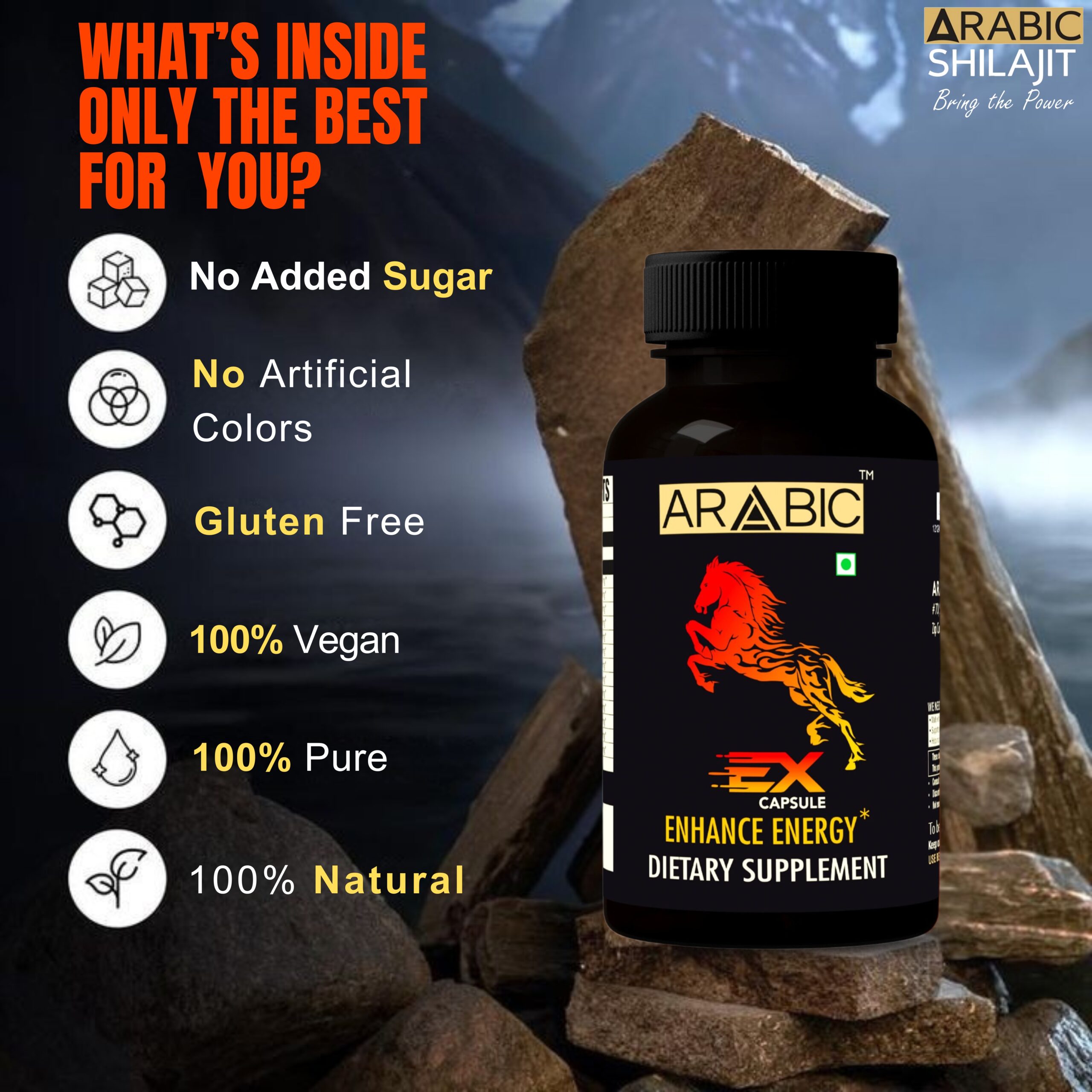 - ARABIC SHILAJIT Ex Enhance Energy Capsules are formulated to naturally boost energy, stamina, and endurance, helping you stay active and perform at your best throughout the day. The powerful blend supports physical strength and overall vitality, making it ideal for men with an active lifestyle.