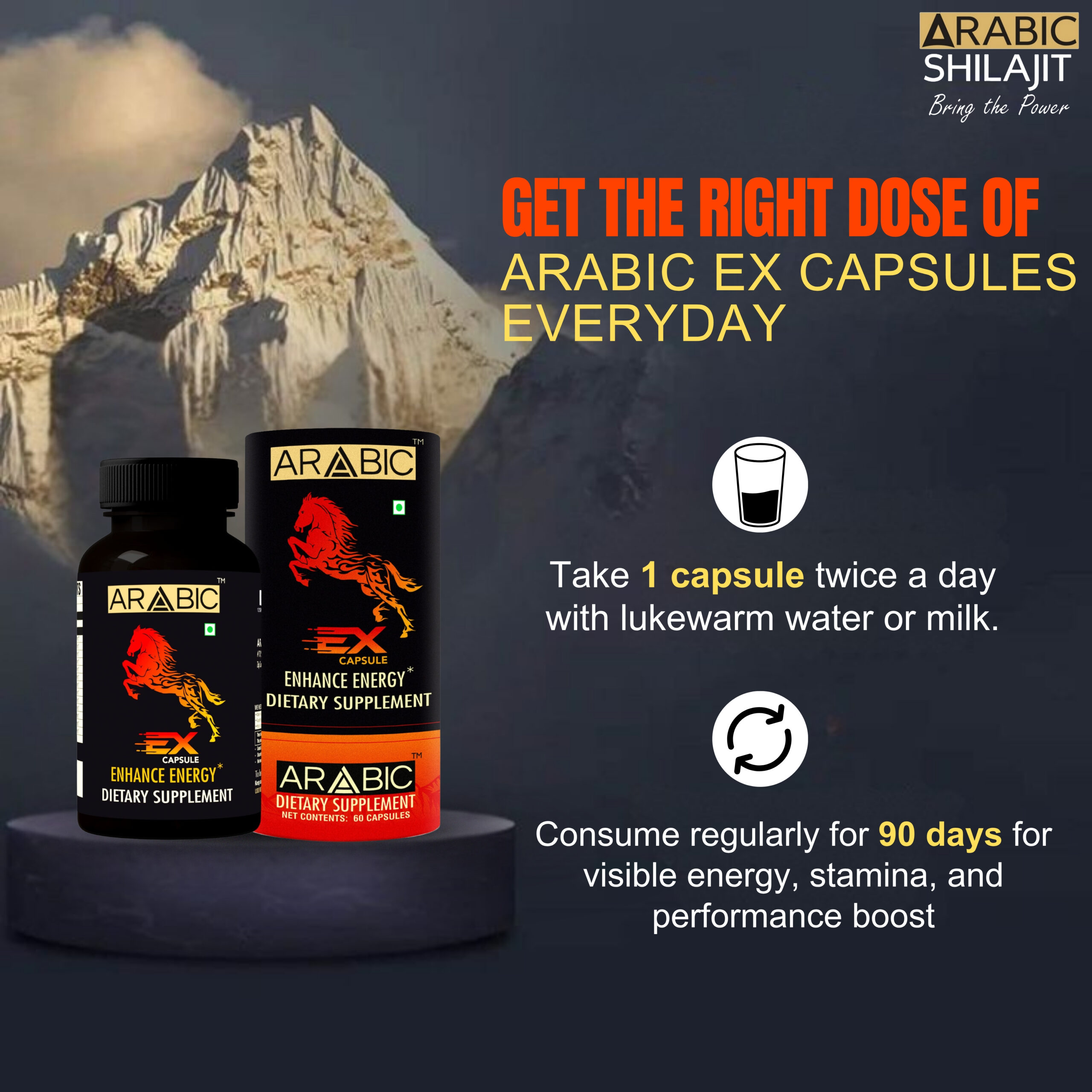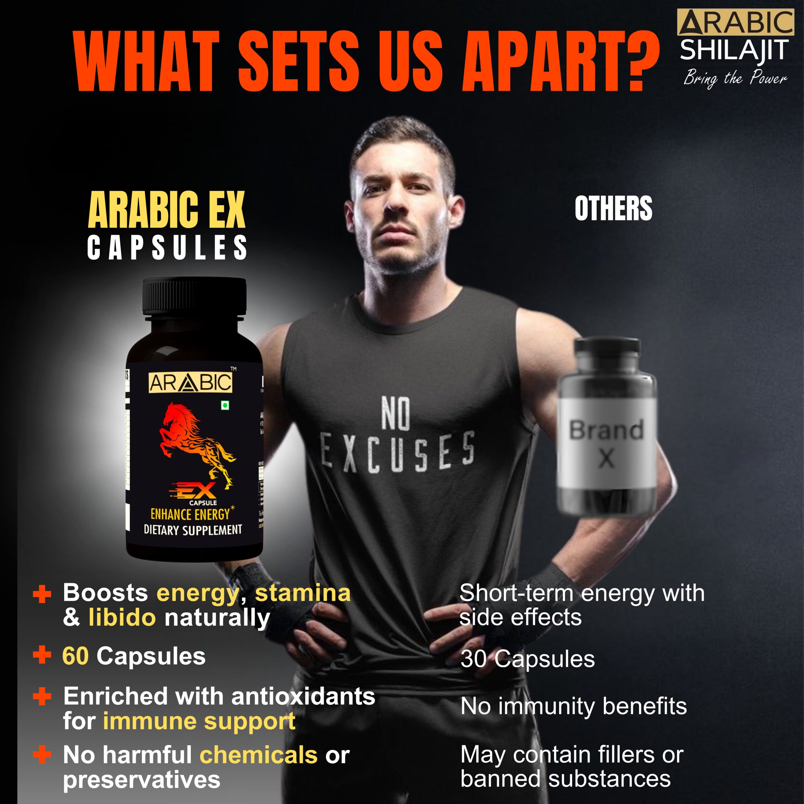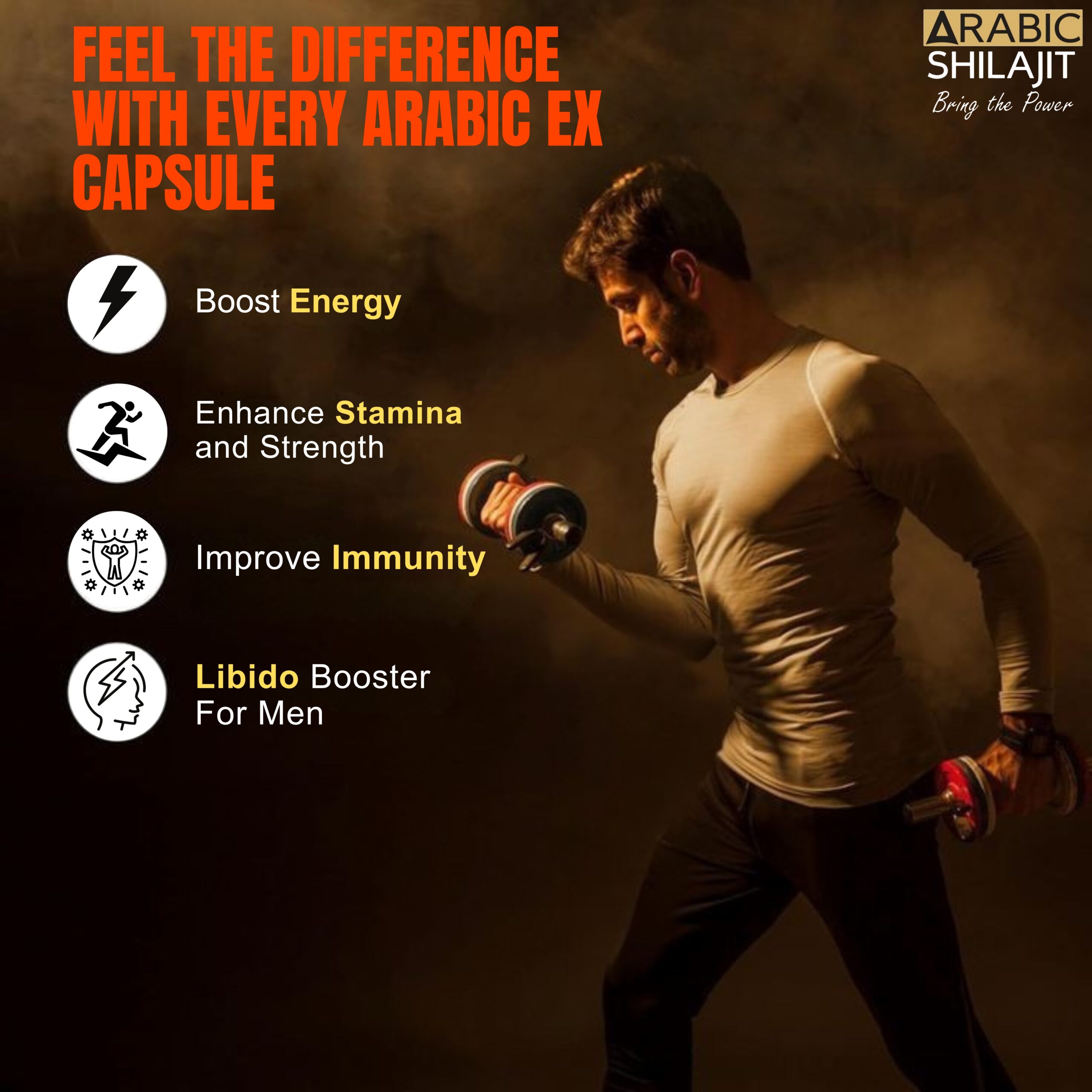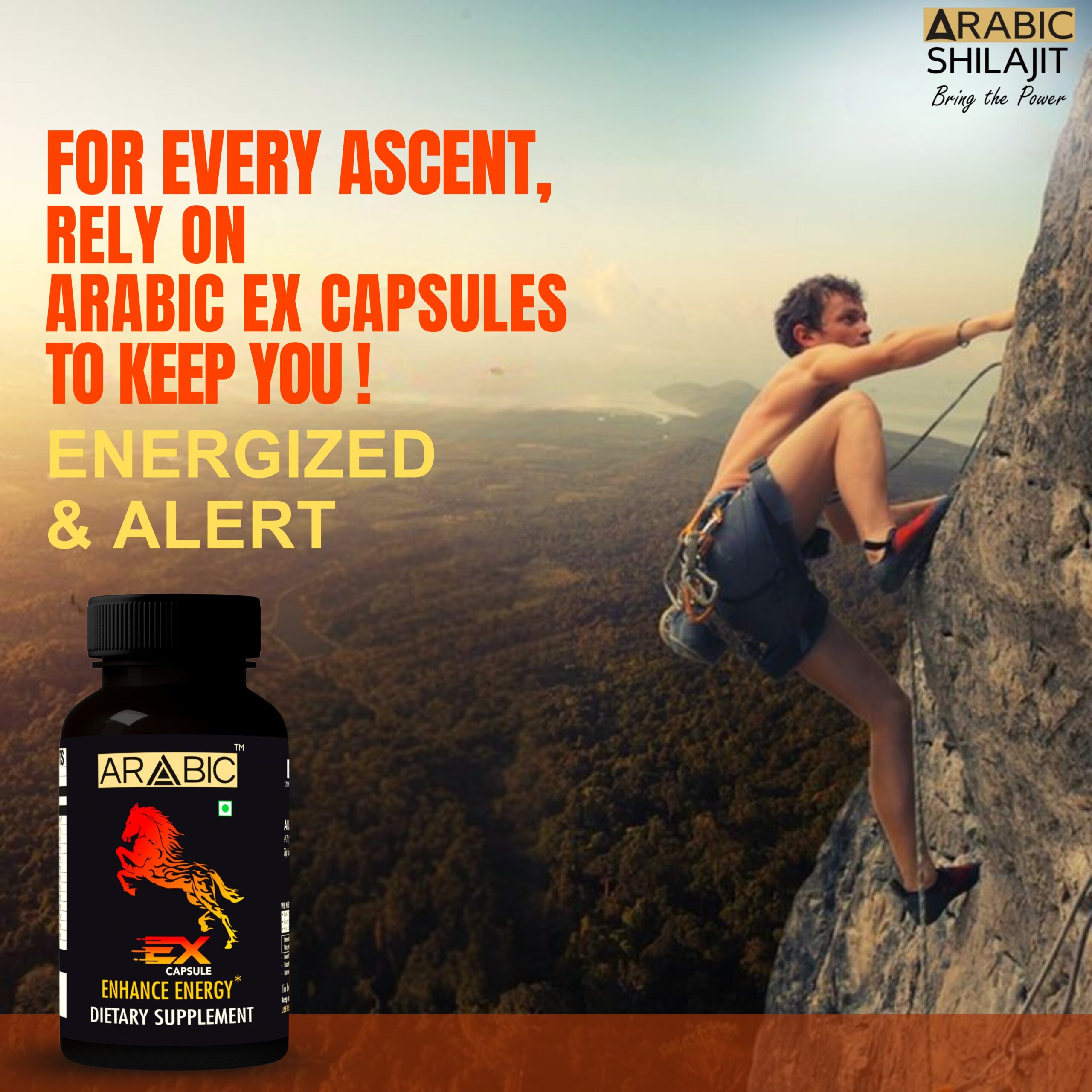 - ARABIC SHILAJIT Ex Enhance Energy Capsules are formulated to naturally boost energy, stamina, and endurance, helping you stay active and perform at your best throughout the day. The powerful blend supports physical strength and overall vitality, making it ideal for men with an active lifestyle.